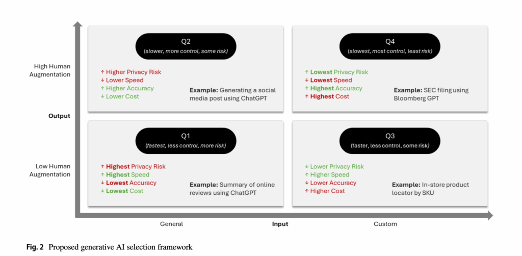 This model helps executives pick between general LLMs (ChatGPT, Claude) and custom or multimodal systems—depending on how much privacy, precision, and human oversight they require.