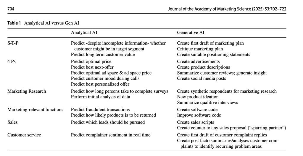 The authors contrast “Analytical AI,” which predicts and optimizes (e.g., next-best-offer, optimal price, fraud detection), with “Generative AI,” which creates—marketing plans, ad copy, social posts, synthetic respondents, even first drafts of complaint replies.