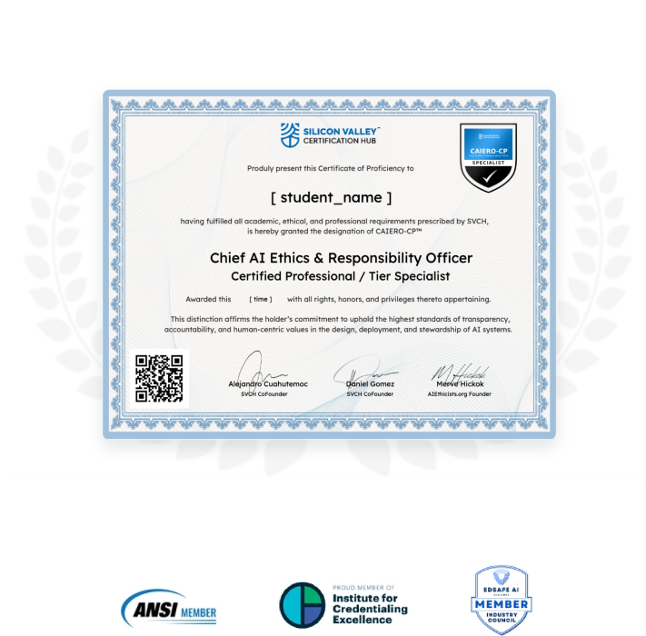 This certification program provides the ethical, regulatory, and leadership skills necessary to guide organizations in the responsible and sustainable use of Artificial Intelligence.