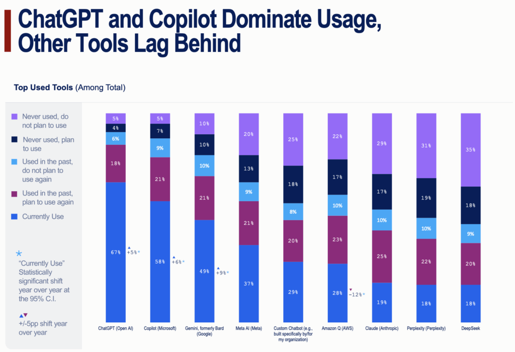 - ChatGPT and Microsoft Copilot dominate adoption.