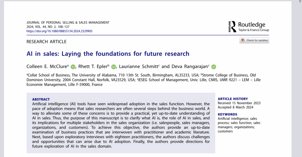 This week, we’re featuring a new study published in the Journal of Personal Selling & Sales Management titled “AI in Sales: Laying the Foundations for Future Research.”