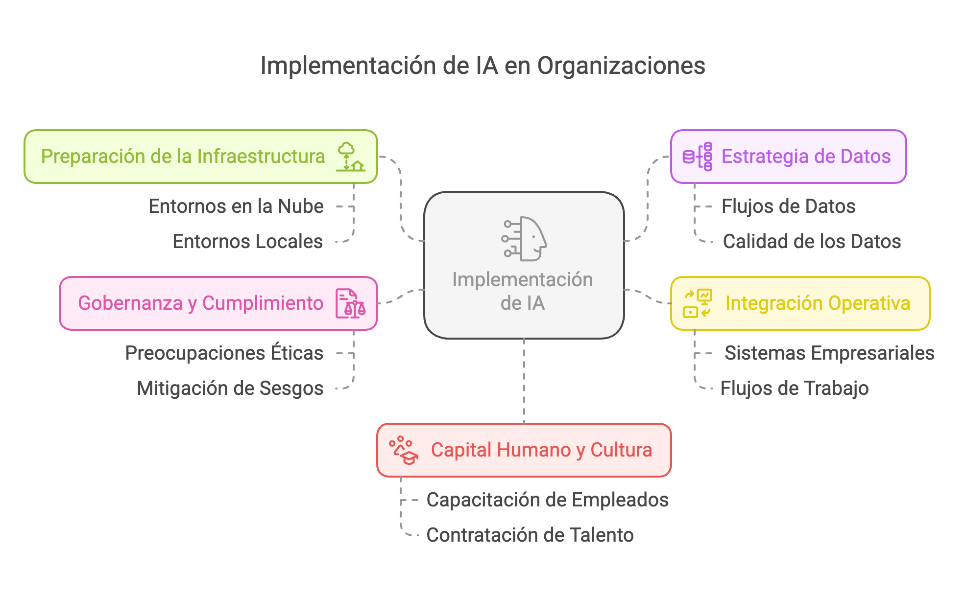 - Integración Operativa: La IA debe incorporarse sin problemas en los procesos empresariales y la toma de decisiones.