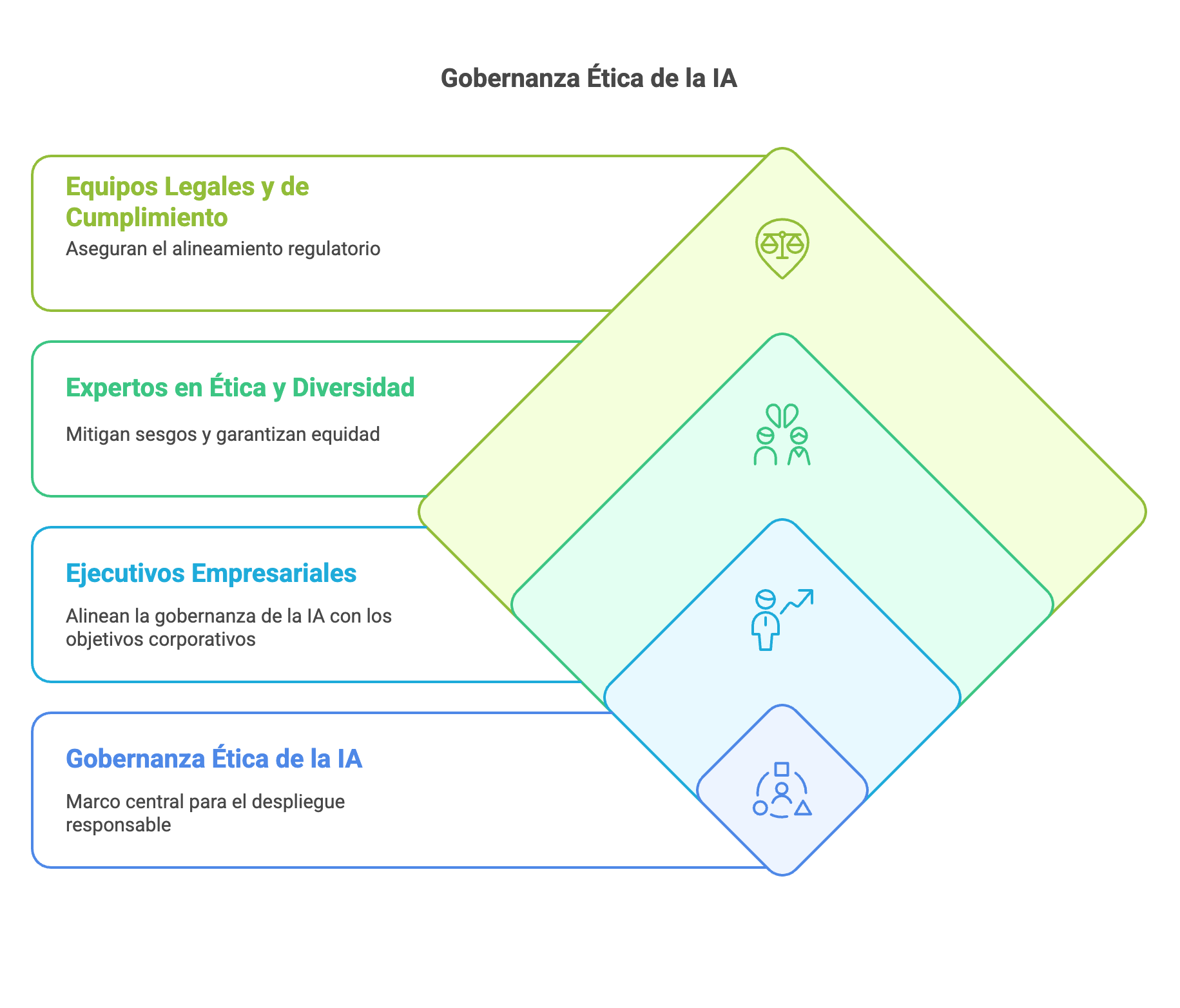 Para mantener un despliegue ético de la IA, las organizaciones deben crear Comités de Ética en IA o Consejos de IA Responsable con actores clave como: